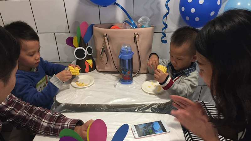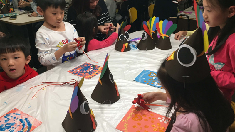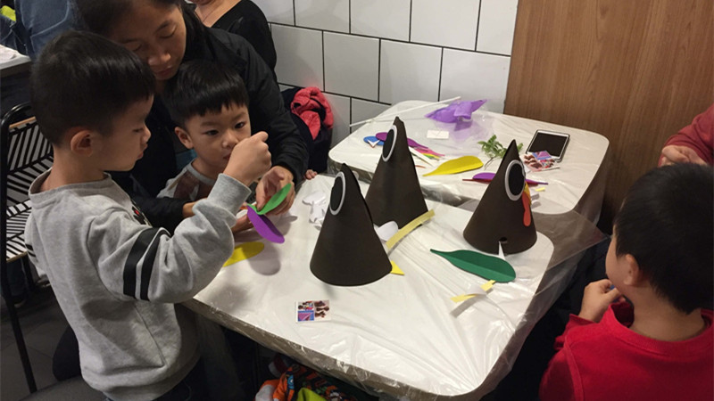 边听边看老师的指导,宝贝们都在爸爸妈妈的帮助下,一步一步地把火鸡帽完成。