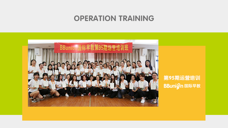 “用爱与责任传播专业的早教,陪伴孩子健康、快乐成长,培养具备20年后社会需求的强竞争力人才”是每一位BBunion人的使命。我们用专业知识武装自己,做最品质的早教人。我们一起学习早教专业知识,婴幼儿发育指标、敏感期教育重点;认知BBunion品牌文化与教育理念,汲取早教4.0模式精髓;知晓中心运营建设标准;掌握市场推广及方案制定策略;探讨销售七步曲,掌握销售能力与技巧。